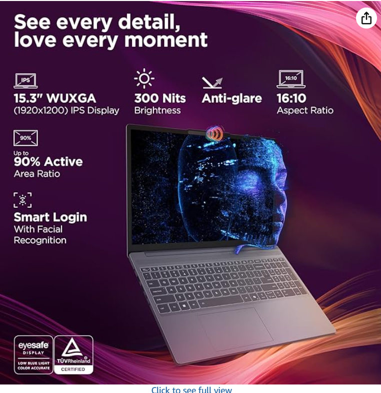 - Display: 15.3″ FHD (1920×1200) | 300Nits Brightness | Anti Glare |TUV Low Blue Light Certified