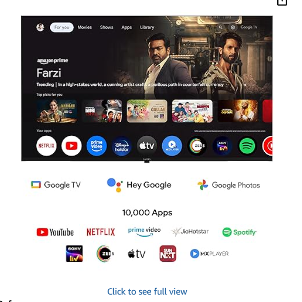 | Special Feature | Dolby Vision Game Mode | ALLM | MEMC, Google TV | Google Assistant | Google Cast, India’s Fastest Smart TV*, TLDR – Your Arena for Sports & Music, Quad Driver Speakers (2 Tweeter + 2 Full Range) | Dolby Atmos, Ultra Wide Color Gamut (108% DCI-P3)(79% Rec.2020), 4K HDR | Dolby Vision | HDR10 | HLG | 4K Upscaling, HDMI 2.1 x 3 (1 with eARC) | USB 3.0 x1, USB 2.0 x2 | HDMI Bandwidth 48Gbps |