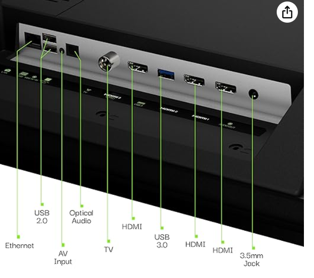 - Connectivity: WiFi 2.4GHz/5GHz 802.11a/b/g/n/ac | Bluetooth 5 | HDMI 2.1 x 3 (1 with eARC) | HDMI Bandwidth 48Gbps | 1 AV Input Mini | 1 Digital Audio Output Optical | 3.5mm Audio Output Supports upto 300Ω load | USB 3.0 x1, USB 2.0 x2 | Ethernet RJ45 x1 (100Mbps)