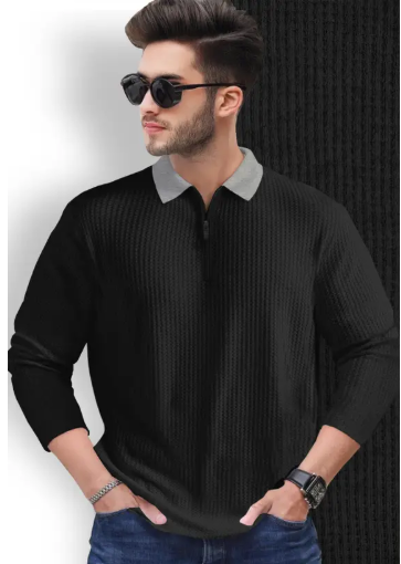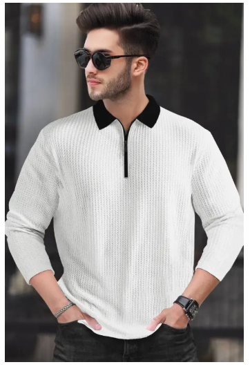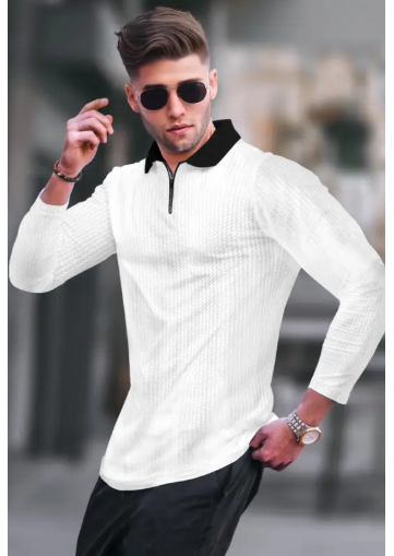 Men Self Design Polo Neck Cotton Blend White, Black T-Shirt